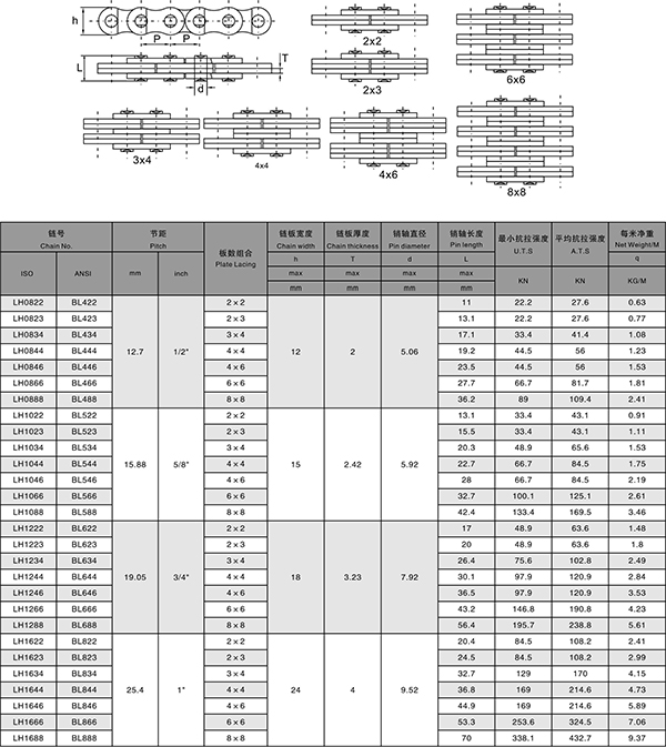 板式链是由多片链板与销轴组合而成,这种结构决定了板式链相比于其它链条,具有更大的强度/重量比,承载能力大,承受冲击能力强,维护简单。