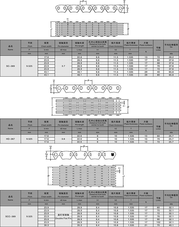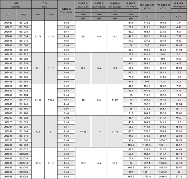 表内最小抗拉强度值不是板式链的工作载荷。在提升应用时,设计者或使用者要给予一个至少为5:1的安全系数。
