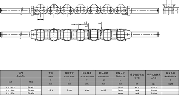 BL系列板式链的零件源于ANSI滚子链标准,链板的外形尺寸等同于同节距滚子链的外链板,但链板的厚度加厚,销轴的直径加大,因此是一种重系列板式链。适于直线往返传动结构。